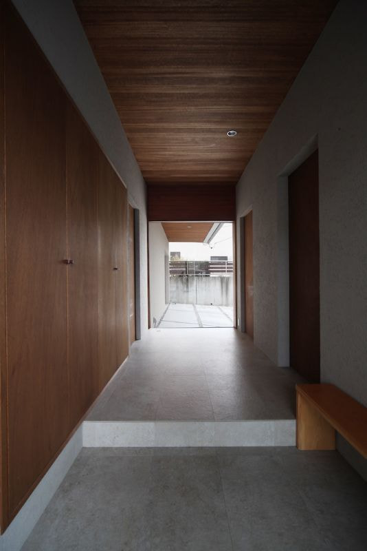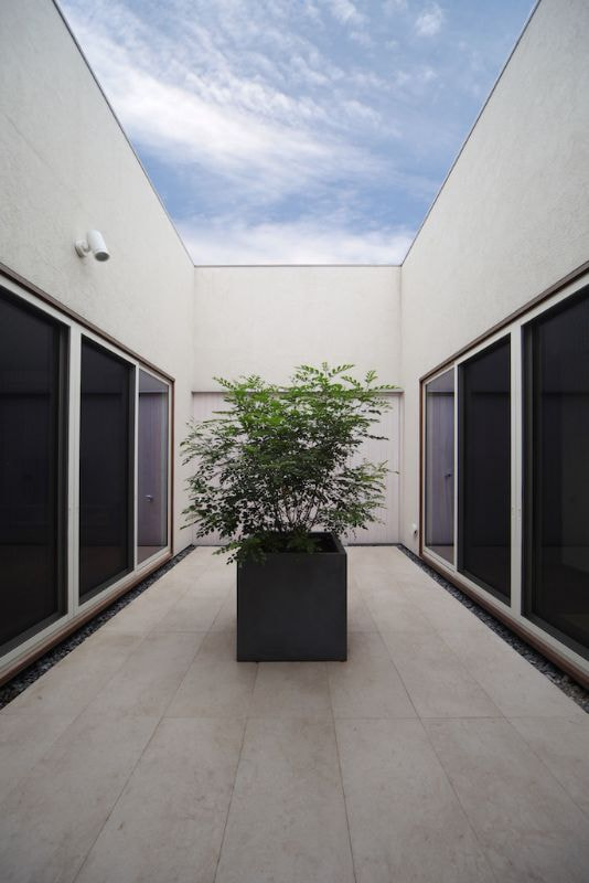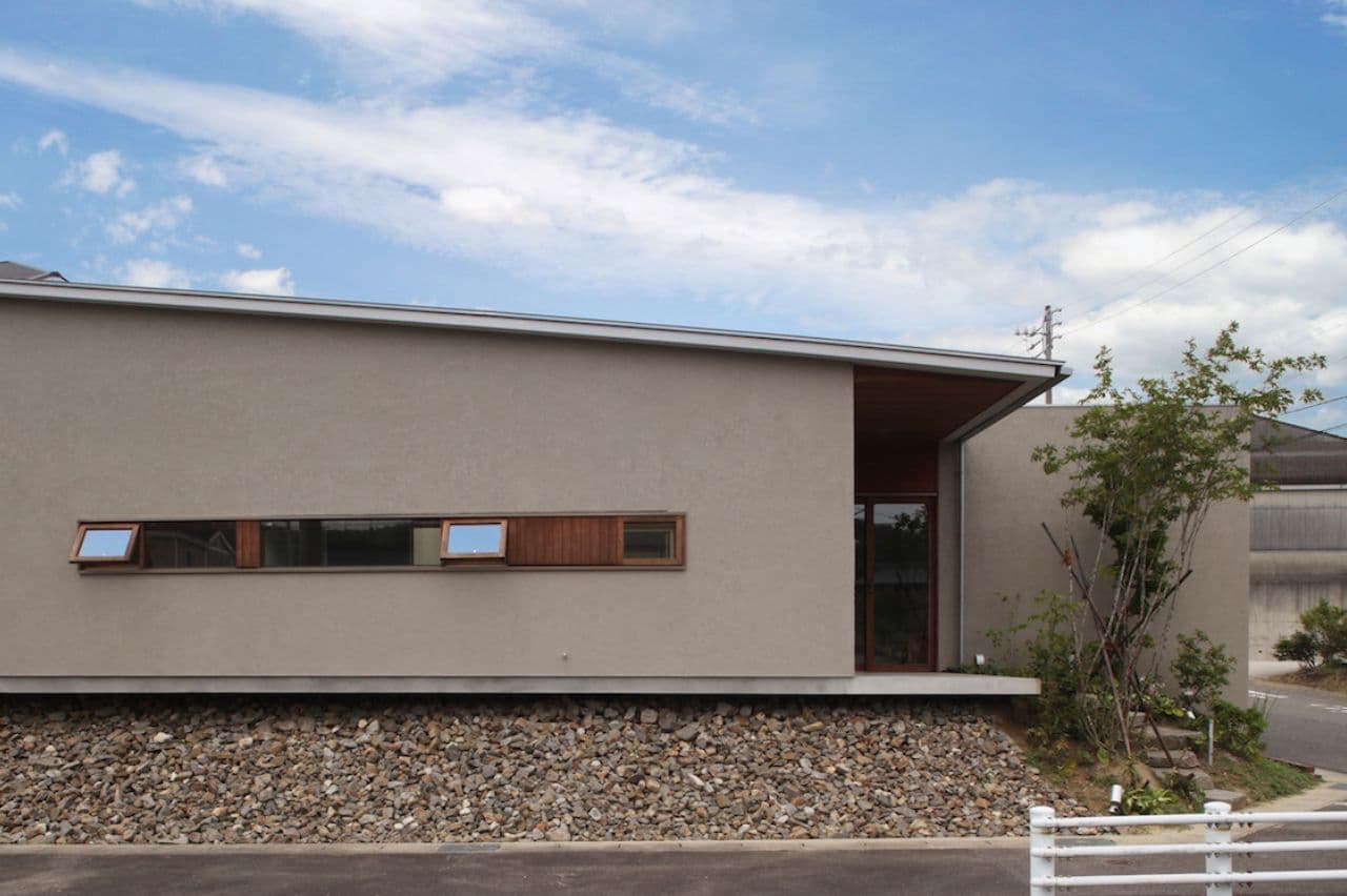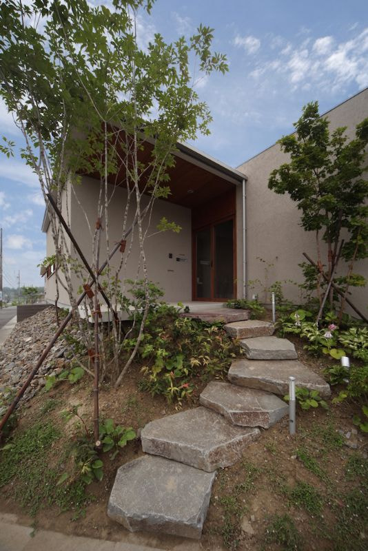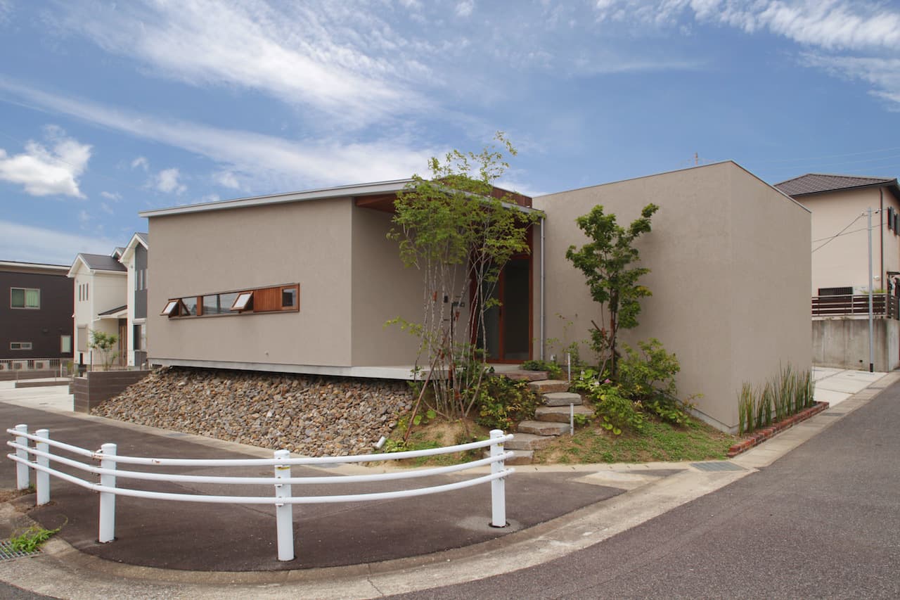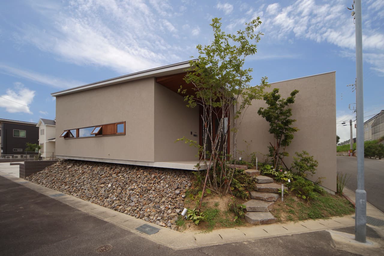 発展途上の新しい住宅街、そして角地という特殊性。この街並みに対してどう建ち振る舞うべきか考え込みました。角地で建てるということは他の場所で建てることよりも責任が重く、住宅ではあるけど、ある種の公共性も兼ね備えるべきなのではないかと考えたわけです。そして、敷地と道路には大きな高低差がありました。周辺の敷地も似たような条件ではあるけど、その多くは擁壁や駐車場で単調に解決され、とても寂しい風景しかありませんでした。そして、今後建つであろう住宅もきっと同じ過ちを繰り返すに違いないと憂慮したわけです。そこで、土地の形状の変形を最小限に抑え、元からあった法面を街への「庭のお裾分け」として考えることにしました。建物はセットバックされ、街行く人に与える圧迫感を抑えることができ、街並みに彩どりを与えることになりました。