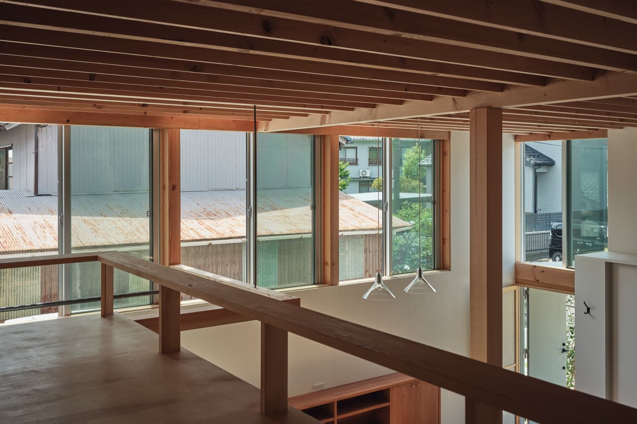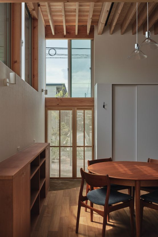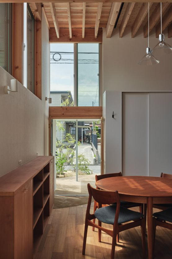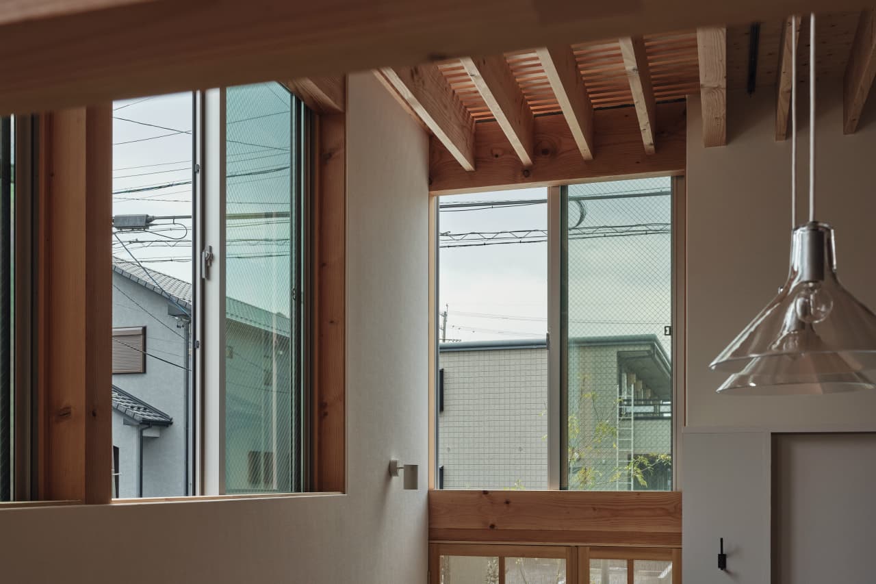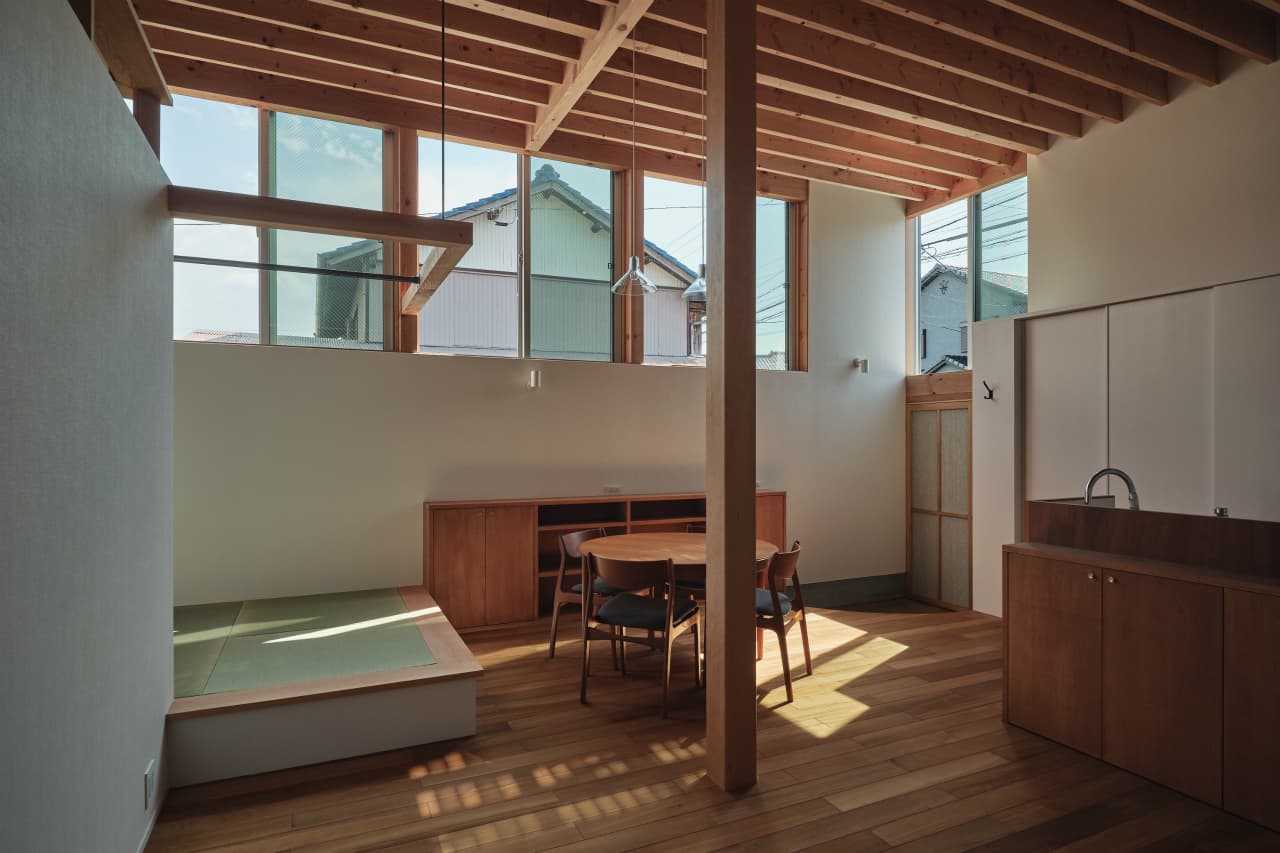 国道沿いの街中にある32坪程の小さな敷地での計画でした。この土地での家づくりを決めた時、果たして、ここで理想の暮らしができるのか施主のNさんは少々不安だったと思います。それでも、もともと生活圏だったこの場所で住み続けることはNさんにとって大切なことの様に感じました。Nさんからの主な要望は「老後は1階だけで暮らせるようにしたい」、「明るくて開放的な空間が欲しい」の二つでした。この小さな敷地では庭のような外部空間をつくるのは難しく、1階でのびのびと暮すのはあまり現実的ではないように感じ、この相反する条件をどう解くのかがキモになりました。
