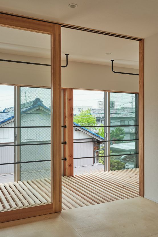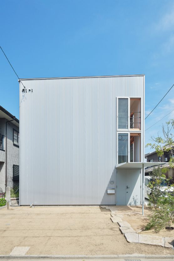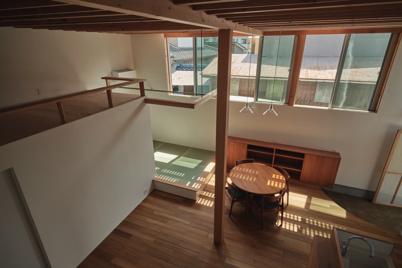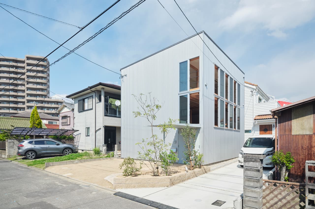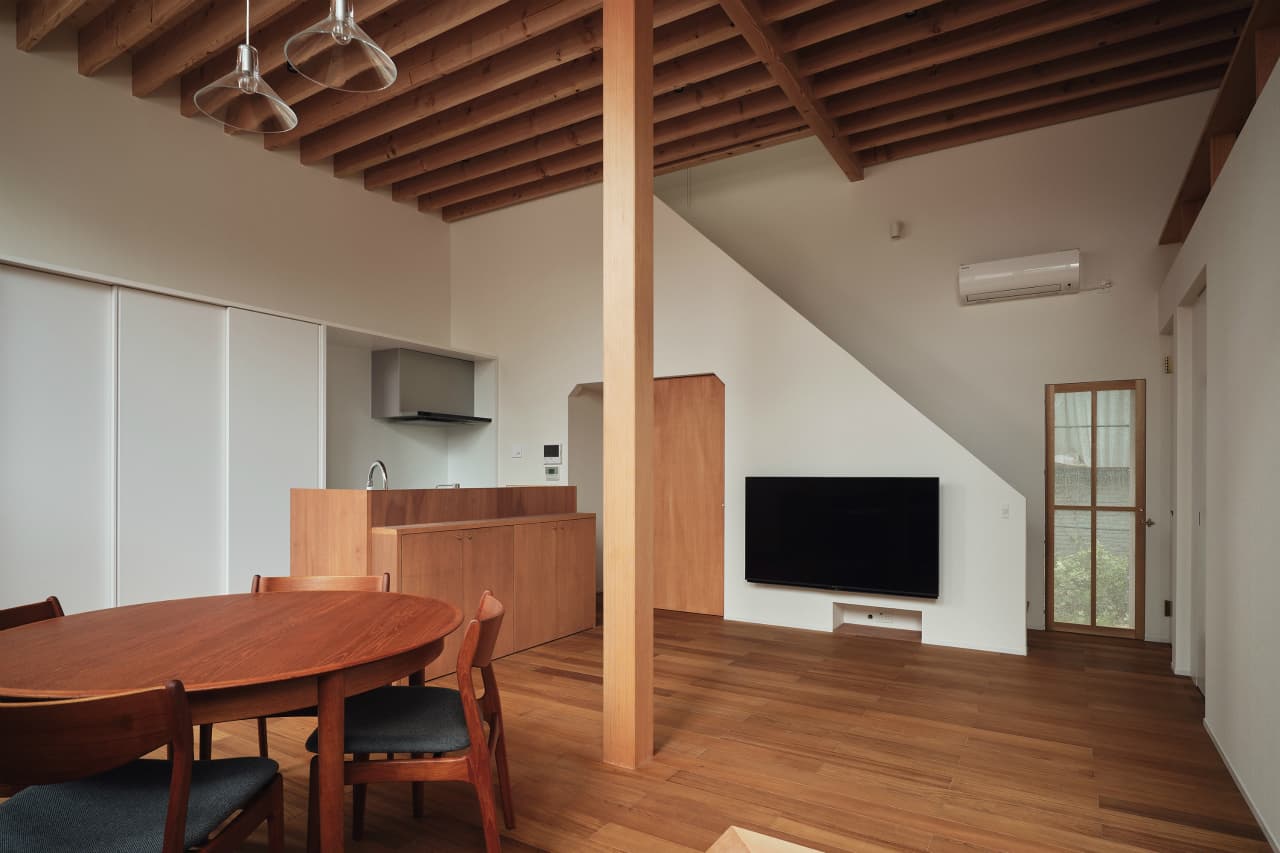 国道沿いの街中にある32坪程の小さな敷地での計画でした。この土地での家づくりを決めた時、果たして、ここで理想の暮らしができるのか施主のNさんは少々不安だったと思います。それでも、もともと生活圏だったこの場所で住み続けることはNさんにとって大切なことの様に感じました。Nさんからの主な要望は「老後は1階だけで暮らせるようにしたい」、「明るくて開放的な空間が欲しい」の二つでした。この小さな敷地では庭のような外部空間をつくるのは難しく、1階でのびのびと暮すのはあまり現実的ではないように感じ、この相反する条件をどう解くのかがキモになりました。