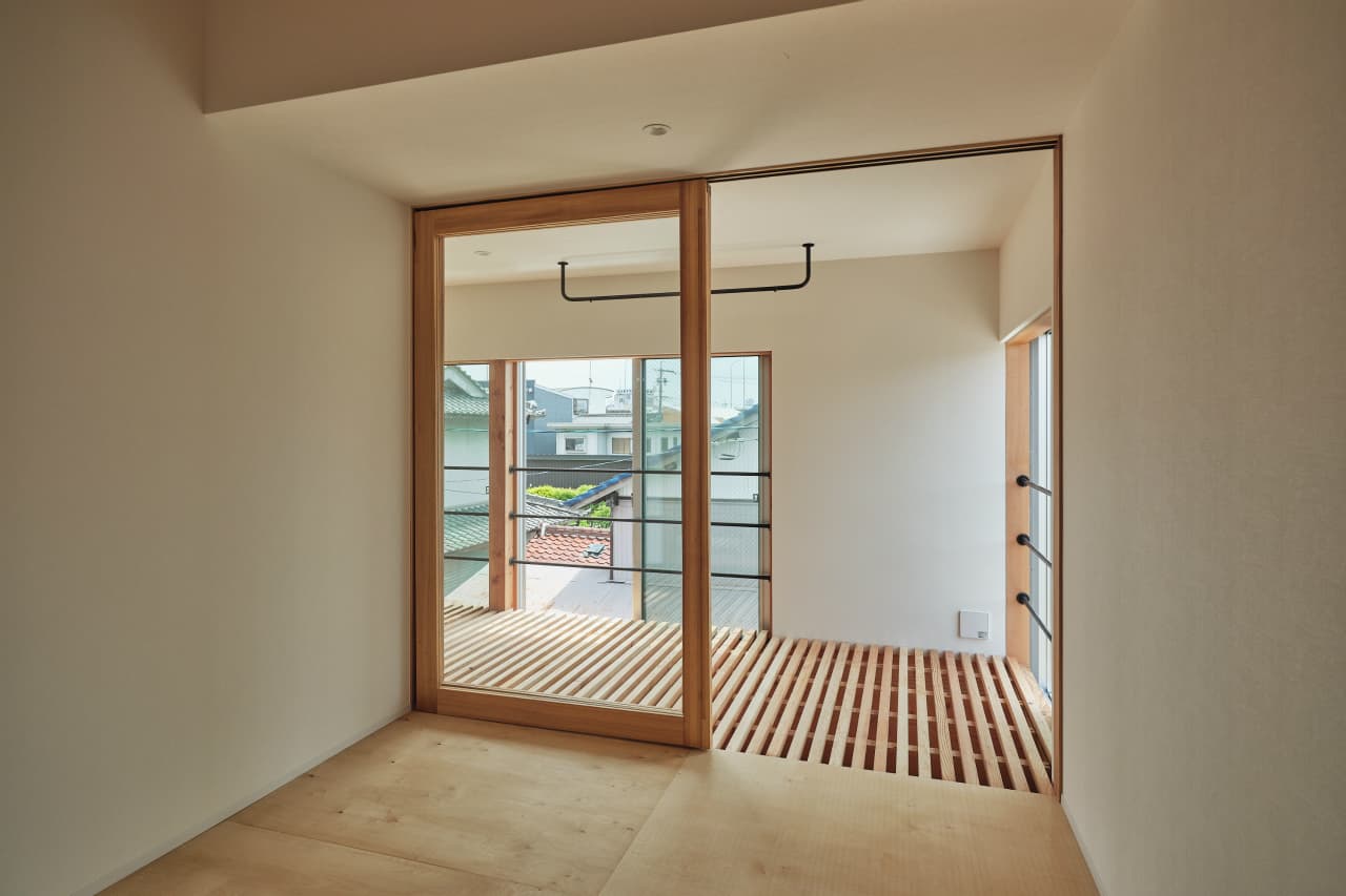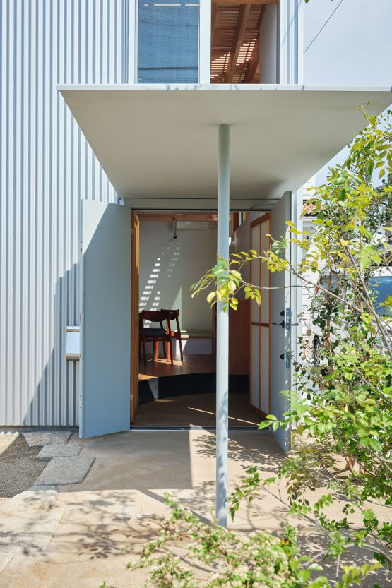 まずは、南の隣地が路地状敷地であったことから、自分の敷地に取り込むことを考えてみました。1階は天井高4mとスケールアウトさせた気積の大きいワンルームをつくり、隣地の上空を空閑地として捉え、大きく開口部を設け周辺環境を取り込むことで、プライバシーを確保しながらも外の空気を大いに感じられるような場を考えました。また、玄関は常時開いておけるような設とし、玄関先の小さな庭が街との心地よい距離感を生み出してくれています。