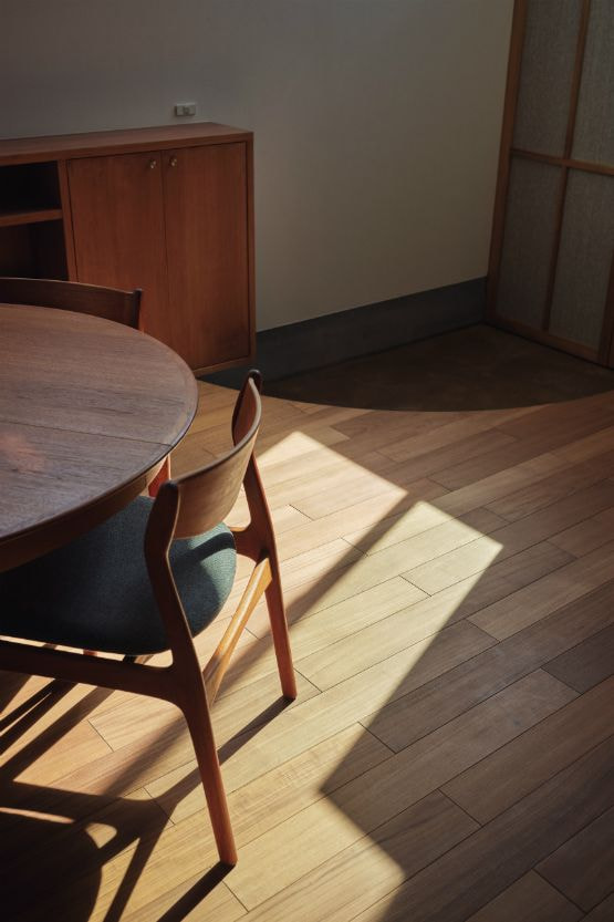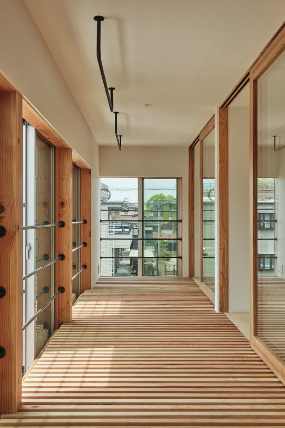 次に、プランと同様に構造体もシンプルに計画しています。耐力壁は外壁だけに配置し、内部の壁は全て間仕切壁としているので、極端な言い方をすれば全て撤去すると倉庫の様ながらんどうな空間になります。間仕切壁は最小限とし、室内の繋がりや街との繋がりを極力隔てないように配慮しました。街との境界が曖昧になった大きな箱に暮らしているような感覚が心地よい開放感をつくりだしています。
